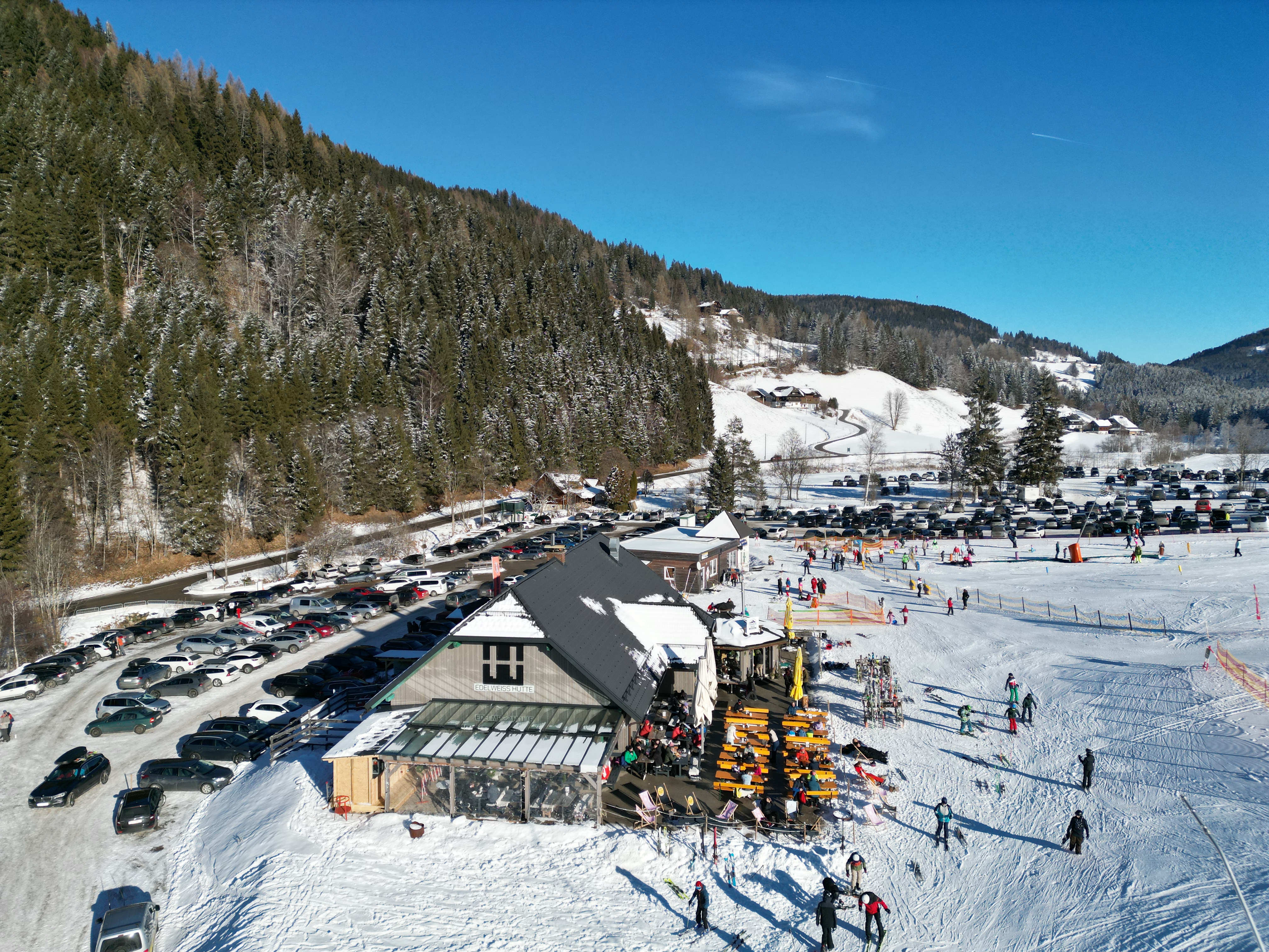 Sonnenterrasse direkt an der Pacheinerabfahrt mit Panoramablick. Hausgemachte Spezialitäten aus der Kärntner Schmankerlküche und original italienische Pizza aus dem Holzofen. Abendlicher Hüttenzauber mit Fondue- oder Ripperl-Essen