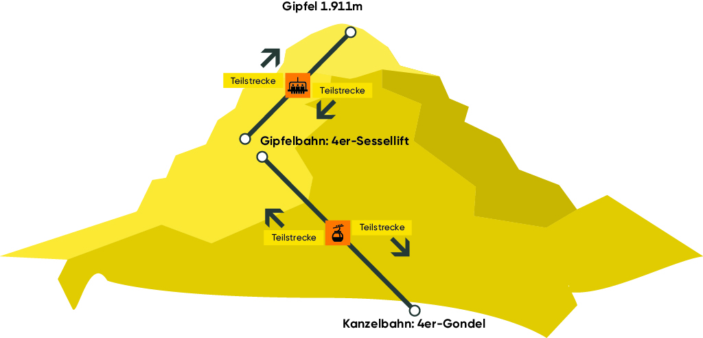 | Gipfelticket: 4 Teilstrecken (KB + GB, jeweils Berg- u. Talfahrt) | 3 Teilstrecken (KB Berg- u.Talfahrt + 1 x GB) | 2 Teilstrecken (KB und/oder GB nach Wahl) | 1 Teilstrecke (KB oder GB nach Wahl) | |||||